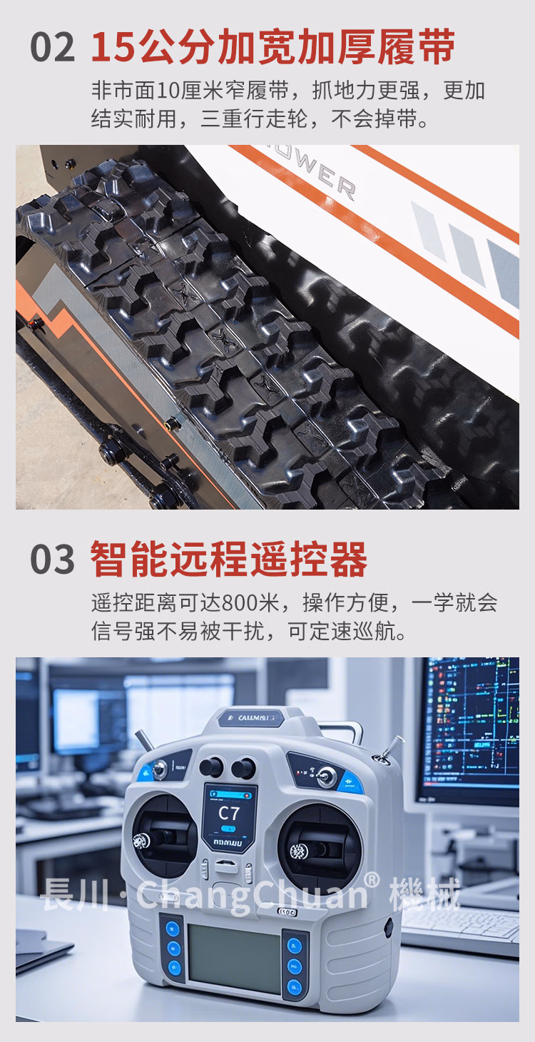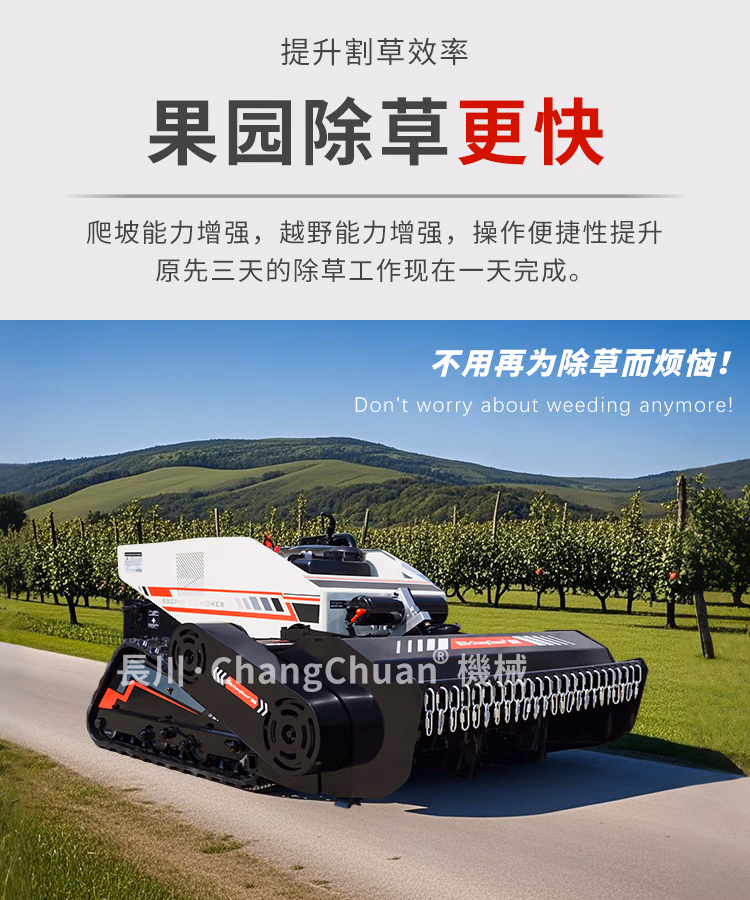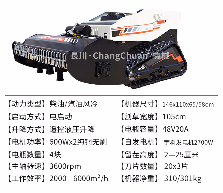 【产品简介】:长川遥控割草机汽油机除草机履带式柴油大功率48V轻混大马力园林绿化 汽油24V标准版(可割85cm宽)