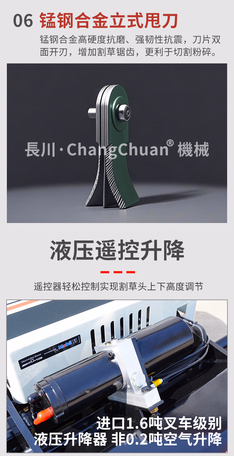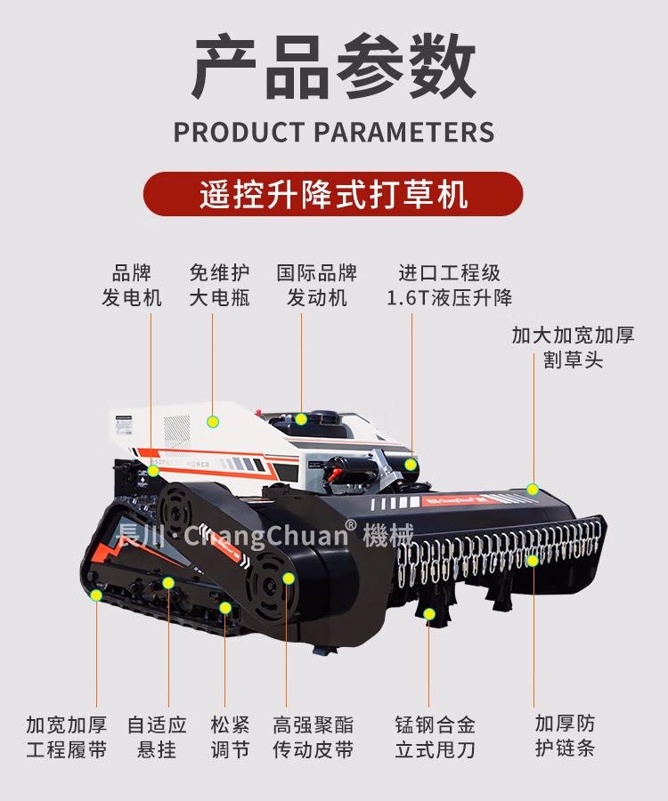 公司专注农林机械的生产制造,现拥有众多完善成熟的产品,主要包括垂刀遥控割草机,平刀遥控割草机,遥控打药机,树枝粉碎机等产品。其中遥控割草机有汽油动力和柴油动力,机器采用油电混合动力,都具备自身发电功能,垂刀结构适合山地果园开荒等崎岖不平的地形,不怕石头砖头树墩等平刀结构适合公园园林草坪的修剪整理,产品覆盖面广泛,应用领域众多。